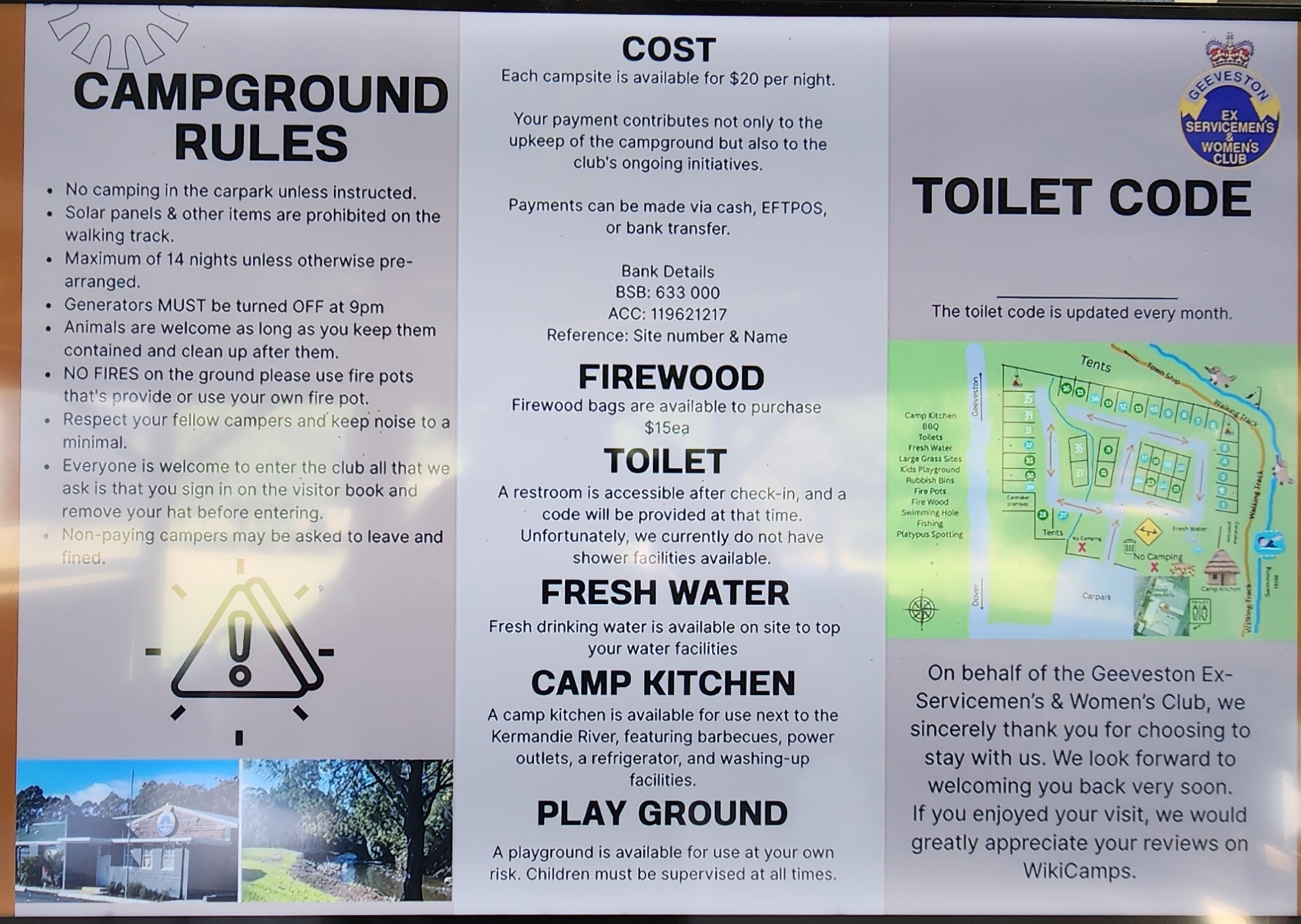 Parking: Toilets, water, bins, 96hrs, pets on lead, mobile service